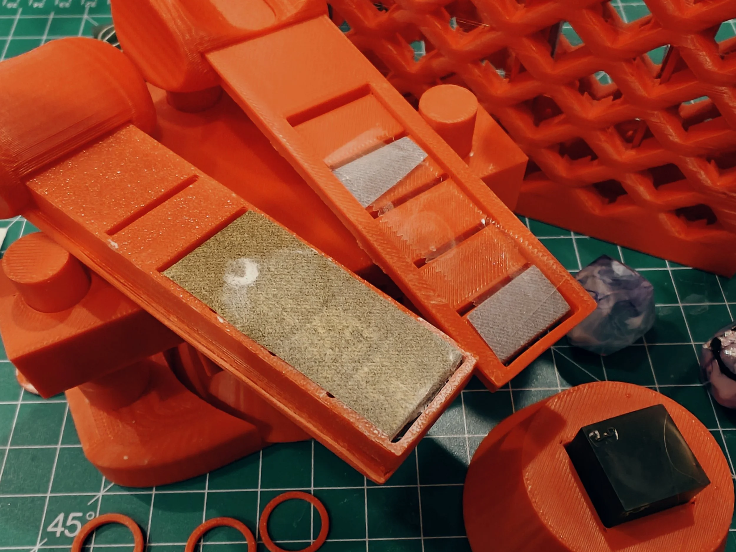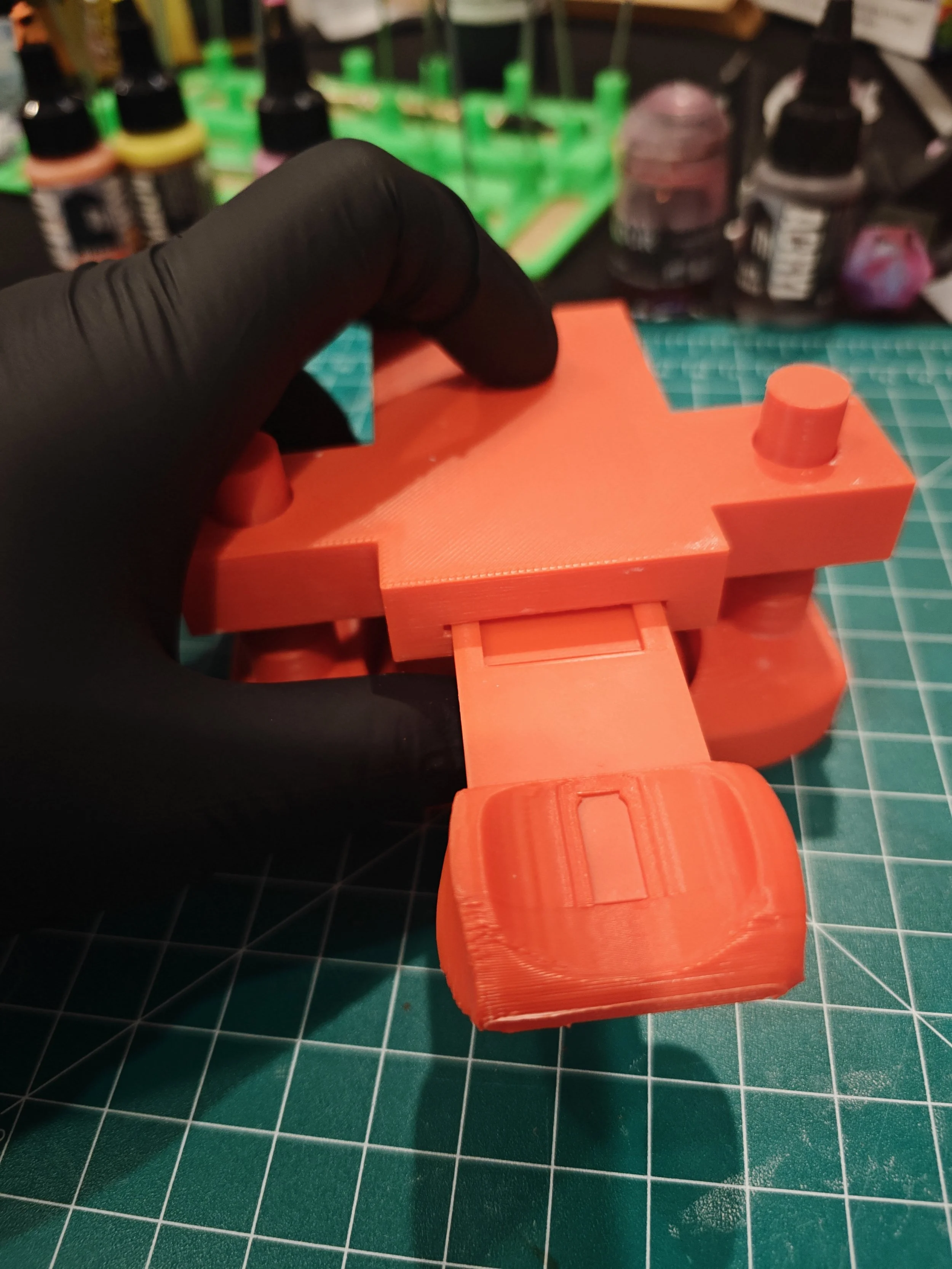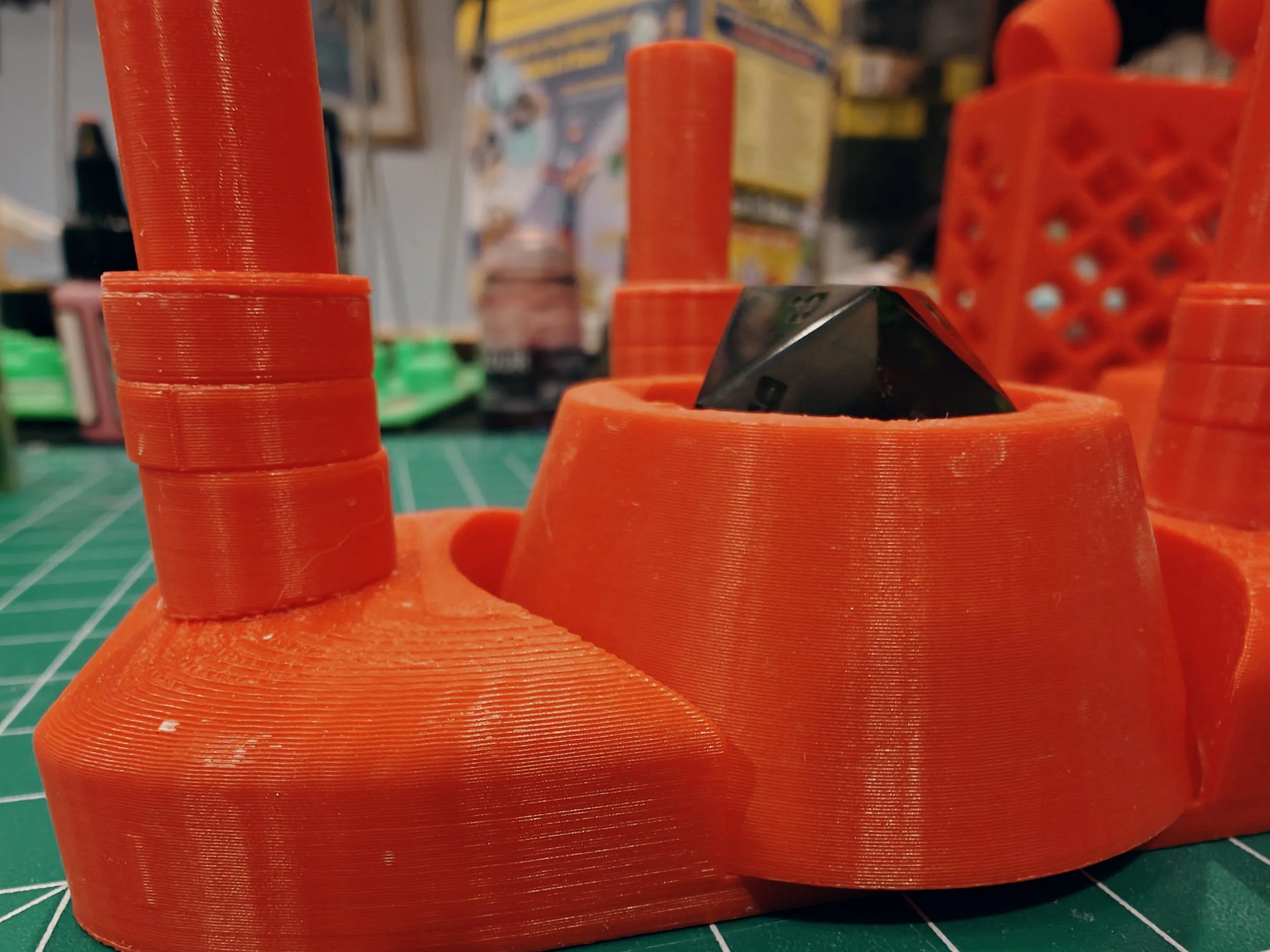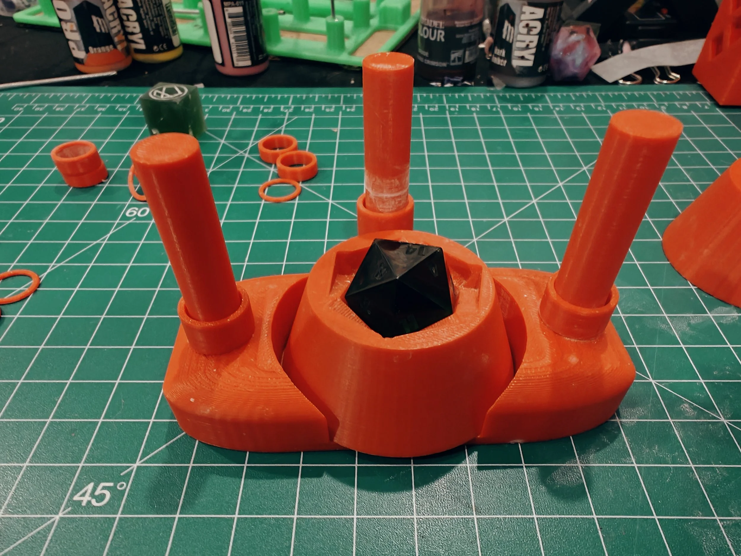 ADD THE SUPPORT RINGS ON THE POLES TO SUPPORT THE TOP EVENLY. YOU SHOULD MAKE IT ABOUT 1MM UNDER THE HEIGHTH OF THE BASE EITH THE DICE IN IT. YOU SHOULD BE ABLE TO PUSH DOWN ON THE TOP WITHOUT IT WOBBLING